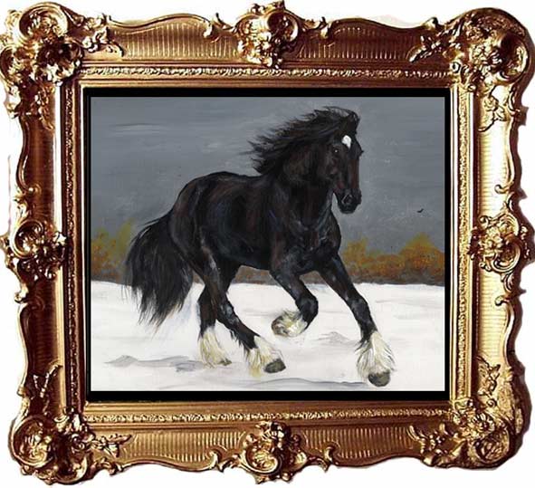 2010, A winter Canter, acrylic, art, ARTIST, artwork, canvas, canvas painting, cold, equestrian, equine, frosty, horse, ice, Landscape, Linda Slater, painting, painting by Linda Slater, shire, snow