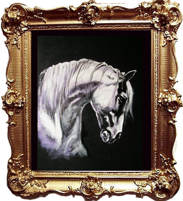 2010, art, ARTIST, artwork, canvas, canvas painting, equestrian, equine, for sale, grey, head, horse, Linda Slater, painting, portrait, The Grey Andalusian