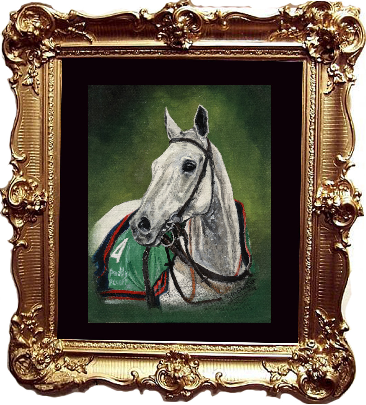3rd, acrylic, art, ARTIST, artwork, chase, equestrian, equine, famous, grey, horse, Horse Racing, Horses, Linda Slater, Monet's Garden, Old Roan, painting, painting by Linda Slater, portrait, racing, victory, win, winner