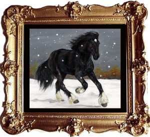 2010, acrylic, art, ARTIST, artwork, black, canvas, canvas painting, equestrian, equine, horse, Landscape, Linda Slater, painting, painting by Linda Slater, shire, snow, winter
